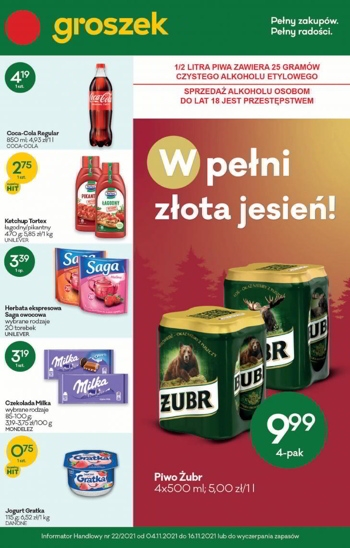 {loadposition linkGroszek} 'W pełni złota jesień' - nowa gazetka promocyjna sieci sklepów Groszek. Polecane promocje z gazetki Groszek: Piwo Żubr 4x500 ml - 9,99 zł. Ketchup Tortex 470 g - 2,75 zł. Czekolada Milka 100 g - 3,19 zł.…