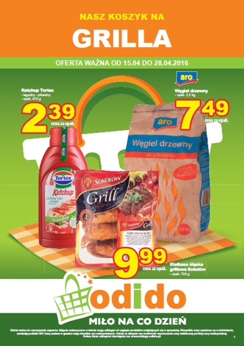 Nowa gazetka promocyjna sklepów Odido - "Nasz koszyk na grilla". Polecane promocje z gazetki Odido: Kiełbasa śląska grillowa Sokołów 700 g - 9,99 zł. Ketchup Tortex 470 g - 2,39 zł. Węgiel drzewny Aro 2,5 kg - 7,49…