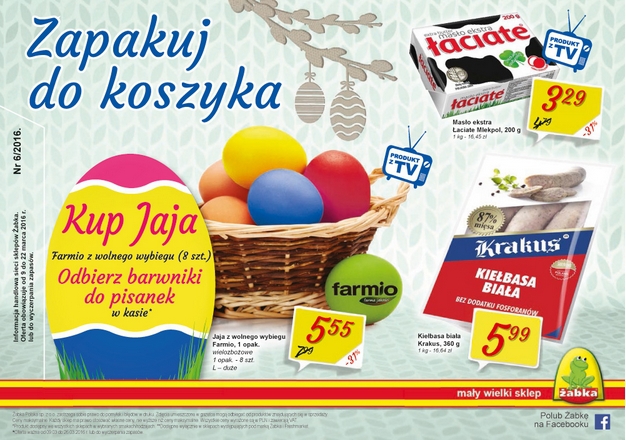 Nowa gazetka promocyjna sieci sklepów Żabka - "Zapakuj do koszyka". Polecane promocje z gazetki Żabka: Jaja z wolnego wybiegu Farmio klasa L 8 sztuk - 5,55 zł. Masło ekstra Łaciate Mlekpol 200 g - 3,29 zł. Kiełbasa biała…
