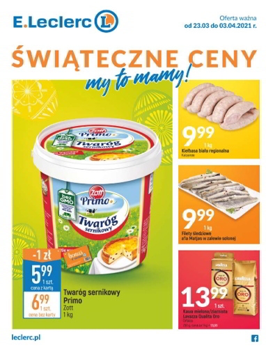 {loadposition linkEleclerc2} 'Świąteczne ceny my to mamy!' - nowa gazetka promocyjna sieci handlowej E.Leclerc. Polecane promocje z gazetki E.Leclerc: Twaróg sernikowy Primo Zott 1 kg - 5,99 zł*. Kiełbasa biała regionalna Kabanos 1 kg - 9,99 zł. Filety śledziowe…