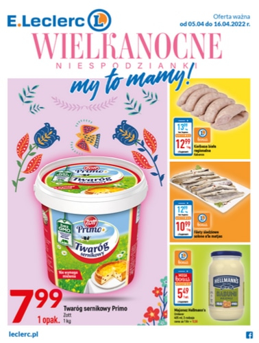 {loadposition linkEleclerc} 'Wielkanocne niespodzianki my to mamy!' - nowa gazetka promocyjna sieci handlowej E.Leclerc. Polecane promocje z gazetki E.Leclerc: Twaróg sernikowy Primo Zott 1 kg - 7,99 zł. Kiełbasa biała regionalna Kabanos 1 kg - 12,99 zł*. Filety śledziowe…