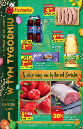 {loadposition linkBiedronka2} 'W tym tygodniu wszystko na wielkanocny stół' - nowa gazetka promocyjna sieci sklepów Biedronka. Polecane promocje z gazetki sieci Biedronka: Mandarynki 1 kg - 2,85 zł. Kiełbasa biała surowa Kraina Mięs 500 g - 4,39 zł. Majonez…
