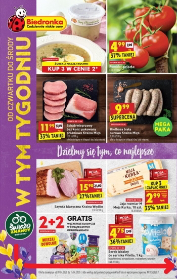 'W tym tygodniu' - nowa gazetka promocyjna sieci sklepów Biedronka. Polecane promocje z gazetki sieci Biedronka: Pomidory gałązka 1 kg - 4,99 zł. Kiełbasa biała surowa Kraina Mięs 1 kg - 9,99 zł. Szynka klasyczna Kraina Wędlin 1…