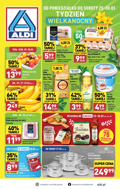 Polecane promocje z gazetki Aldi: 'Tydzień wielkanocny' - nowa gazetka promocyjna sieci sklepów Aldi. Polecane promocje z gazetki Aldi: Kiełbasa biała surowa Mięsne Specjały 500 g - 5,99 zł. Jaja ściółkowe klasa M Wesoły Kurnik 20 sztuk - 9,99…
