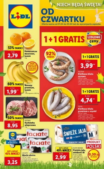 {loadposition linkLidl1} 'Od poniedziałku Wielkanoc wielkich oszczędności' - nowa gazetka promocyjna sieci sklepów Lidl. Polecane promocje z gazetki sklepów Lidl: Jaja Złota Nioska klasa M 10 sztuk - 6,35 zł*. Kiełbasa biała surowa Rzeźnik 500 g - 5,49 zł**.…