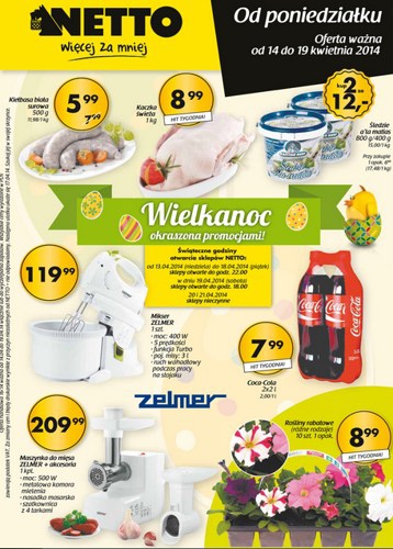 {loadposition linkNetto} Nowa gazetka promocyjna Netto - "Wielkanoc okraszona promocjami!". Polecane promocje z gazetki Netto: Kiełbasa biała surowa 500 g - 5,99 zł. Kaczka świeża 1 kg - 8,99 zł. Mikser Zelmer 400 W - 119,99 zł. …