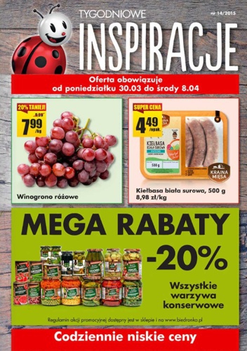 {loadposition linkBiedronka} Nowa gazetka promocyjna sieci handlowej Biedronka - "Inspiracje tygodniowe". Polecane promocje z gazetki sieci Biedronka: Winogrono różowe 1 kg - 7,99 zł. Kiełbasa biała surowa Kraina Mięsa 500 g - 4,49 zł. Pomarańcze 1 kg - 2,69…