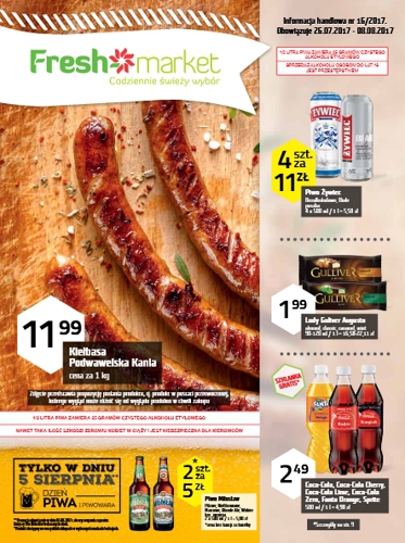 {loadposition linkFreshmarket} Nowa gazetka promocyjna sieci sklepów Freshmarket. Polecane promocje z gazetki Freshmarket: Kiełbasa podwawelska Henryk Kania 1 kg - 11,99 zł. Piwo Żywiec 4x500 ml - 11 zł. Lody Guliver Augusto różne rodzaje - 1,99 zł.…