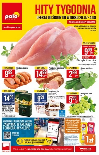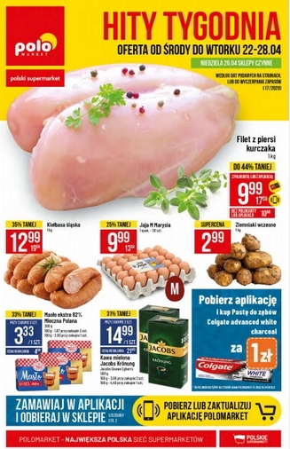 'Hity tygodnia' - nowa gazetka promocyjna sieci sklepów Polo Market. Polecane promocje z gazetki Polo Market: Filet z piersi kurczaka 1 kg - 9,99 zł*. Kiełbasa śląska 1 kg - 12,99 zł. Jaja Marysia klasa M…