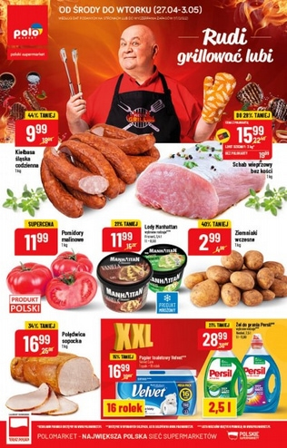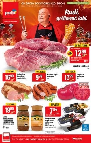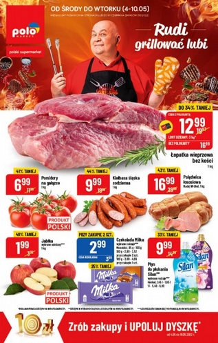 {loadposition linkPoloMarket2} 'Rudi grillować lubi' - nowa gazetka promocyjna sieci sklepów Polo Market. Polecane promocje z gazetki Polo Market: Łopatka wieprzowa bez kości 1 kg - 12,99 zł*. Pomidory na gałązce 1 kg - 6,99 zł. Kiełbasa śląska codzienna…