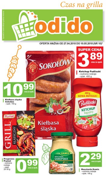 'Czas na grill' - nowa gazetka promocyjna sklepów Odido. Polecane promocje z gazetki Odido: Kiełbasa śląska Sokołów 700 g - 10,99 zł. Ketchup Pudliszki 480 g - 3,89 zł. Przyprawa do grilla Prymat różne rodzaje - 0,99…