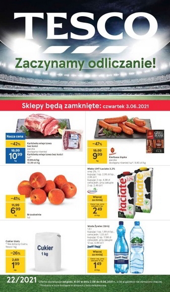 {loadposition linkTesco} 'Zaczynamy odliczanie!' - nowa gazetka promocyjna sieci sklepów Tesco. Polecane promocje z gazetki Tesco: Karkówka wieprzowa bez kości 1 kg - 10,99 zł. Kiełbasa Śląska Sokołów 1 kg - 9,99 zł. Brzoskwinie 1 kg - 6,99 zł.…