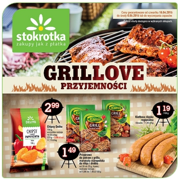 Nowa gazetka promocyjna sieci handlowej Stokrotka - "Grillove przyjemności". Polecane promocje z gazetki Stokrotka: Kiełbasa śląska regionalna Olewnik 100 g - 1,19 zł. Przyprawa do potraw z grilla Kamis 200 g - 1,49 zł. Chipsy Delito 150 g…