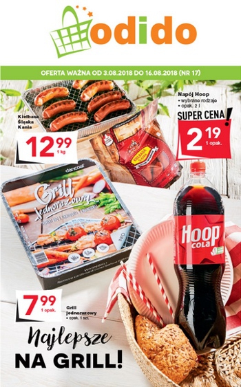 'Najlepsze na grill!' - nowa gazetka promocyjna sklepów Odido. Polecane promocje z gazetki Odido: Grill jednorazowy - 7,99 zł. Kiełbasa śląska Henryk Kania 1 kg - 12,99 zł. Napój gazowany Hoop Cola 2 L - 2,19 zł.…