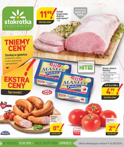 'Tniemy ceny*' - nowa gazetka promocyjna sieci sklepów Stokrotka. Polecane promocje z gazetki Stokrotka: Schab wieprzowy dobrze wykrojony 1 kg - 11,88 zł. Masło ekstra polskie Mlekovita 2x200 g - 9,98 zł. Kiełbasa śląska Morliny 100 g…
