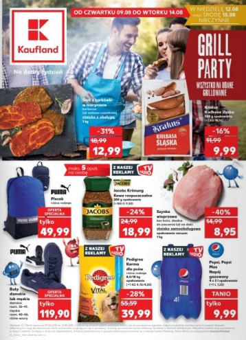 {loadposition linkKaufland} 'Grill party - wszystko na udane grillowanie' - nowa gazetka promocyjna sieci marketów Kaufland. Polecane promocje z gazetki Kaufland: Stek z karkówki w marynacie 1 kg - 12,99 zł. Kiełbasa śląska Krakus 550 g - 9,99 zł.…