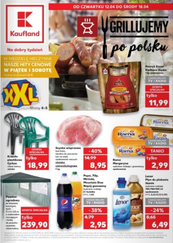 {loadposition linkKaufland} 'Grillujemy po polsku' - nowa gazetka promocyjna sieci marketów Kaufland. Polecane promocje z gazetki Kaufland: Kiełbasa śląska Henryk Kania 1 kg - 11,99 zł. Margaryna Rama wybrane rodzaje i gramatury - 2,99 zł. Pawilon ogrodowy ze…