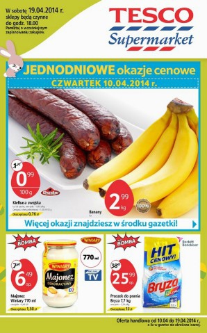 Nowa gazetka promocyjna Tesco. Polecane promocje z gazetki Tesco: Kiełbasa swojska 100 g - 0,99 zł. Banany 1 kg - 2,99 zł. Majonez Winiary 770 ml - 6,49 zł. Oferta ważna od 10.04 do 19.04, o ile…