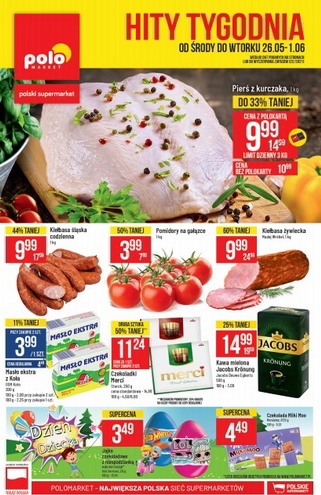 {loadposition linkPoloMarket} 'Hity tygodnia' - nowa gazetka promocyjna sieci sklepów Polo Market. Polecane promocje z gazetki Polo Market: Filet z piersi kurczaka 1 kg - 12,99 zł*. Kiełbasa żywiecka Madej Wróbel 1 kg - 13,99 zł. Pomidory…