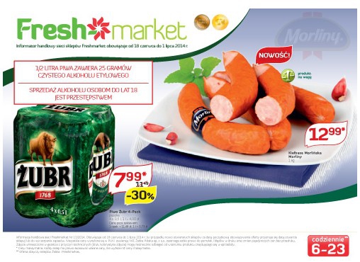 {loadposition linkFreshmarket} Nowa gazetka promocyjna Freshmarket. Polecane promocje z gazetki Freshmarket: Piwo Żubr 4x500 ml - 7,99 zł. Kiełbasa Morlińska Morliny 1 kg - 12,99 zł. Kiełbasa Żywiecka Krakus 1 kg - 19,99 zł. Oferta ważna od 18.06…