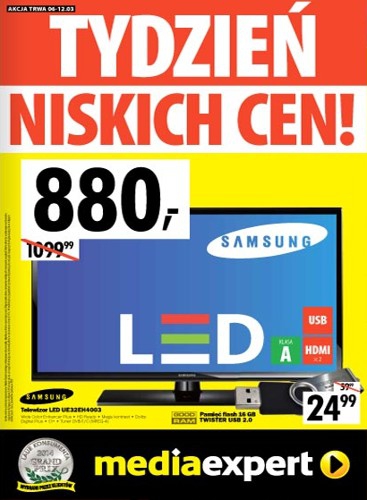 {loadposition linkMediaExpert} Nowa gazetka promocyjna Media Expert - "Tydzień niskich cen". Polecane promocje z gazetki Media Expert: Telewizor LED 32" SAMSUNG UE32EH4003 - 880 zł. Kino domowe LG DH4430P - 599 zł. Notebook LENOVO Z710 - 3399 zł. …