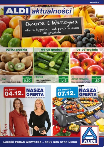 {loadposition linkAldi} Nowa gazetka promocyjna Aldi. Polecane promocje z gazetki Aldi: Kiwi 1 sztuka - 0,50 zł. Body damskie z koronką - 29,99 zł. Bielizna damska bezszwowa - 19,99 zł. Oferta ważna od 2.12 do wyczerpania zapasów.