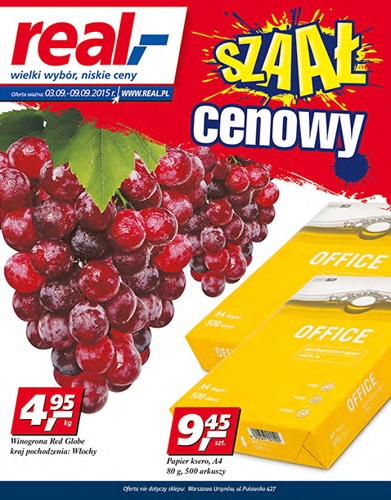 Nowa gazetka promocyjna sieci handlowej Real - "Szaał cenowy". Polecane promocje z gazetki Real: Winogrona Red Globe 1 kg - 4,95 zł. Papier ksero A4 500 arkuszy - 9,45 zł. Kiwi 2 sztuki - 1 zł. Oferta…