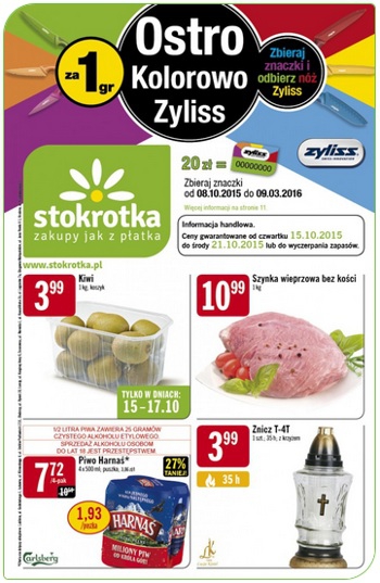 Nowa gazetka promocyjna sieci handlowej Stokrotka. Polecane promocje z gazetki Stokrotka: Kiwi 1 kg - 3,99 zł. Szynka wieprzowa bez kości 1 kg - 10,99 zł. Piwo Harnaś 4x500 ml - 7,72 zł. Oferta ważna od 15.10…