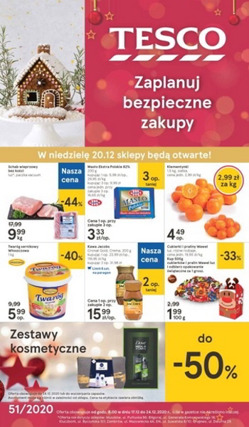 'Zaplanuj bezpieczne zakupy' - nowa gazetka promocyjna sieci sklepów Tesco. Polecane promocje z gazetki Tesco: Schab wieprzowy bez kości 1 kg - 9,99 zł. Masło Ekstra Polskie Mlekovita 3x200 g - 9,99 zł. Klementynki 1 kg - 4,49 zł.…