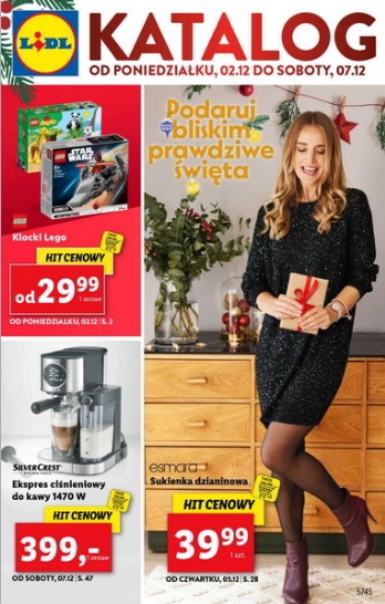 {loadposition linkLidl} 'Podaruj bliskim prawdziwe święta' - nowa gazetka promocyjna sieci sklepów Lidl. Polecane promocje z gazetki sklepów Lidl: Sukienka damska dzianinowa Esmara - 39,99 zł. Klocki LEGO - od 29,99 zł. Ekspres ciśnieniowy do kawy SilverCrest 1470…