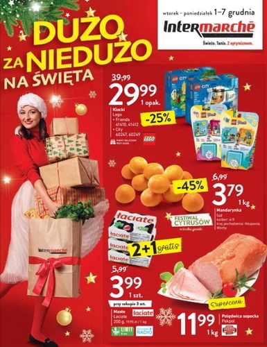 {loadposition linkIntermarche2} 'Dużo za niedużo na święta' - nowa gazetka promocyjna sieci sklepów Intermarche Polecane promocje z gazetki Intermarche: Klocki LEGO - 29,99 zł. Mandarynki 1 kg - 3,79 zł. Polędwica sopocka Pekpol 1 kg - 11,99 zł. …