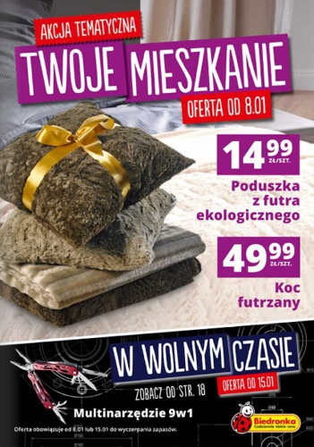 {loadposition linkBiedronka} Nowa gazetka promocyjna sieci handlowej Biedronka - "Pomysł na wnętrze". Polecane promocje z gazetki sieci Biedronka: Koc futrzany - 49,99 zł. Poduszka z nadrukiem - 19,99 zł. Poduszka profilowana - 39,99 zł. Oferta ważna od 11.01…