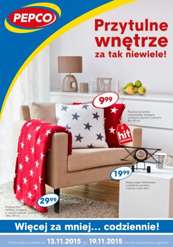 {loadposition linkPepco} Nowa gazetka promocyjna Pepco - "Przytulne wnętrze za tak niewiele!". Polecane promocje z gazetki Pepco: Pluszowa poszewka na poduszkę 40x40 cm - 9,99 zł. Pluszowy koc na łóżko 130x170 cm - 29,99 zł. Stojący zegar dekoracyjny w…
