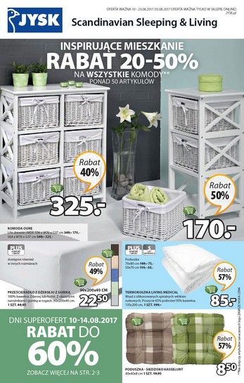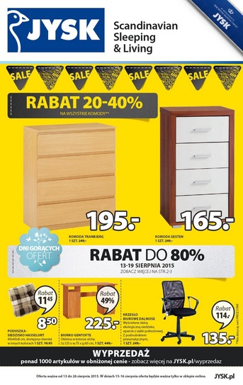 Nowa gazetka promocyjna JYSK. Polecane promocje z gazetki Jysk: Rabat 20-50% na wszystkie komody. Rabat 20-66% na wszystkie prześcieradła. Rabat 20-40% na wszystkie wieszaki. Oferta ważna od 4.08 do 17.08.
