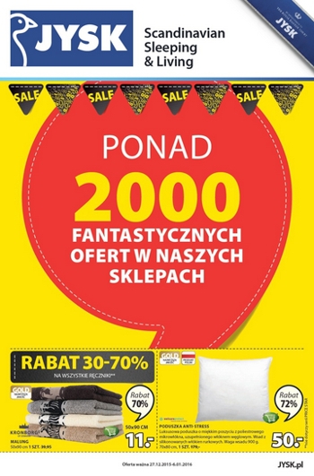 Nowa gazetka promocyjna JYSK - "Ponad 2000 fantastycznych ofert w naszych sklepach". Polecane promocje z gazetki Jysk: Rabat 30-70% na wszystkie ręczniki. Rabat 30-75% na wszystkie firany. Rabat 20-50% na wszystkie komody. Oferta ważna od 27.12 do…