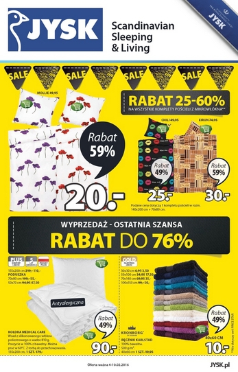 Nowa gazetka promocyjna JYSK - "Wyprzedaż - ostatnia szansa". Polecane promocje z gazetki Jysk: Rabat 25-60% na wszystkie komplety pościeli z mikrowłókna. Rabat 20-50% na wszystkie komody. Rabat 25-60% na wszystkie ceraty. Oferta ważna od 4.02 do…