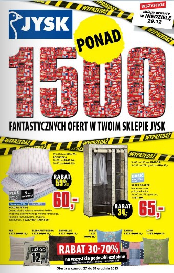 Nowa gazetka promocyjna JYSK - "Ponad 1500 fantastycznych ofert w twoim sklepie Jysk". Polecane promocje z gazetki Jysk: Rabat 30-70% na wszystkie poduszki ozdobne. Rabat 20-50% na wszystkie stoły. Rabat 20-40% na wszystkie komody i kredensy. Oferta…