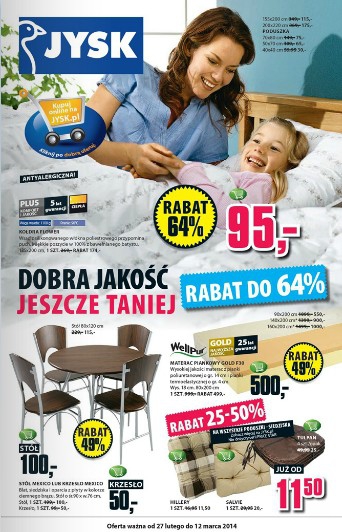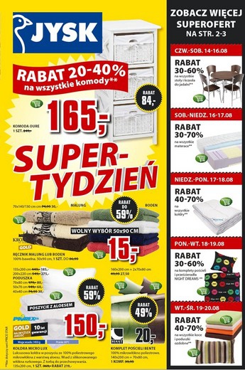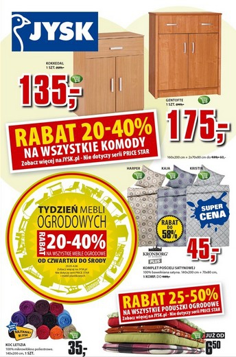 Nowa gazetka promocyjna JYSK - "Super tydzień". Polecane promocje z gazetki Jysk: Rabat 20-40% na wszystkie komody. Rabat 30-70% na wszystkie materace. Rabat 40-70% na wszystkie kołdry. Oferta ważna od 14.08 do 27.08.