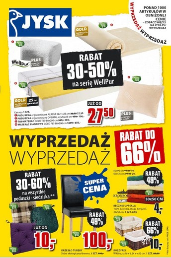 Nowa gazetka promocyjna JYSK - "Wyprzedaż". Polecane promocje z gazetki Jysk: Rabat 30-50% na serię WellPur. Rabat 20-40% na wszystkie komody. Rabat 20-66% na wszystkie akcesoria łazienkowe. Oferta ważna od 24.07 do 8.08.