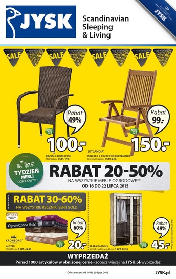 Nowa gazetka promocyjna JYSK. Polecane promocje z gazetki Jysk: Rabat 20-50% na wszystkie meble ogrodowe. Rabat 20-50% na wszystkie komody. Rabat 20-60% na wszystkie materace sprężynowe. Oferta ważna od 16.07 do 29.07.