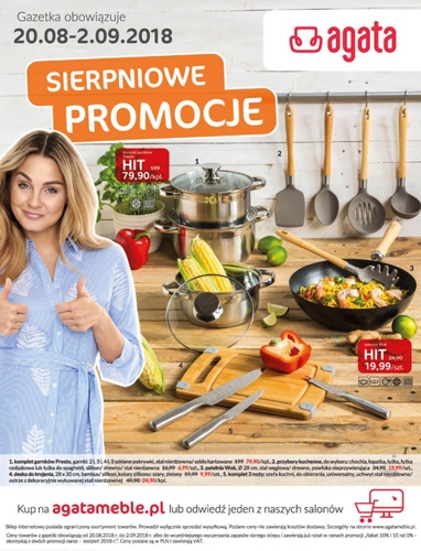 {loadposition linkAgata} 'Sierpniowe promocje' - nowa gazetka promocyjna sieci salonów Agata z artykułami wyposażenia wnętrz. Polecane promocje z gazetki Agata: Komplet garnków Presto - 79,90 zł. Patelnia wok - 19,99 zł. Młynek elektryczny do soli lub pieprzu…