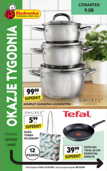 {loadposition linkBiedronka} 'Okazje tygodnia' - nowa gazetka promocyjna sieci sklepów Biedronka. Polecane promocje z gazetki sieci Biedronka: Komplet garnków Smukee 6 elementów - 99 zł. Patelnia Tefal Essential Minute 28 cm - 39,99 zł. Duża torba na zakupy Smukee…