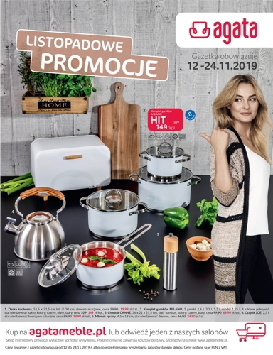 {loadposition linkAgata} 'Listopadowe promocje' - nowa gazetka promocyjna sieci salonów Agata. Polecane promocje z gazetki Agata: Komplet garnków Milano - 149 zł. Chlebak Canne - 69,90 zł. Czajnik Joe - 39,90 zł. Oferta ważna od wtorku…