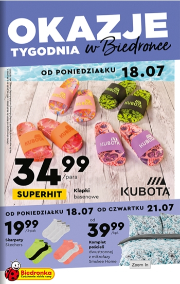 {loadposition linkBiedronka5} 'Okazje tygodnia' - nowa gazetka promocyjna sieci sklepów Biedronka. Polecane promocje z gazetki sieci Biedronka: Klapki basenowe Kubota - 34,99 zł. Skarpety Skechers 3-pak - 19,99 zł. Komplet pościeli dwustronnej z mikrofazy Smukee Home - od 39,99…