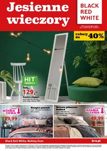 {loadposition linkBRW} 'Jesienne wieczory' - nowa gazetka promocyjna sieci sklepów meblowych Black Red White. Polecane promocje z gazetki Black Red White: Lustro stojące - 129 zł. Komplety pościeli - 29,99 zł. Narzuta pikowana Bedford - 49,99 zł. …