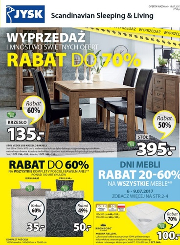 Nowa gazetka promocyjna JYSK - "Wyprzedaż i mnóstwo świetnych ofert!". Polecane promocje z gazetki Jysk: Rabat 20-60% na wszystkie meble. Rabat do 60% na wszystkie komplety pościeli bawełnianej. Rabat 20-50% na wszystkie krzesła biurowe. …