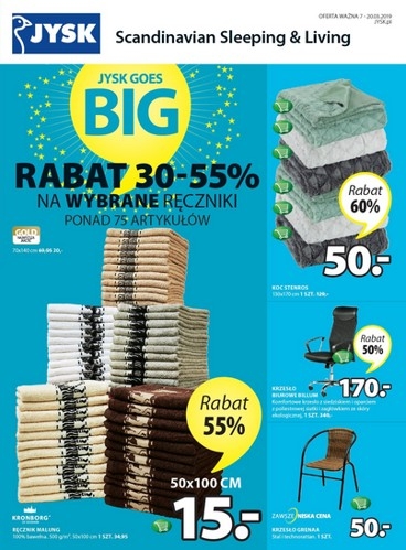 Jysk goes BIG' - nowa gazetka promocyjna sieci sklepów JYSK. Polecane promocje z gazetki Jysk: Rabat 20-55% na szeroki wybrane ręczniki. Rabat 20-40% na szeroki wybór foteli. Rabat 20-49% na wszystkie komplety pościeli dziecięcej. …