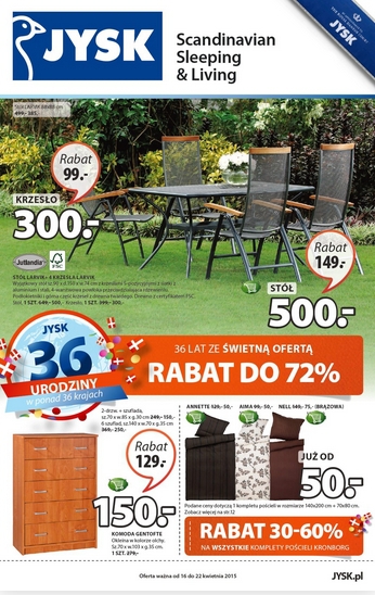 Nowa gazetka promocyjna JYSK - "36 lat ze świetną ofertą, rabat do 72%". Polecane promocje z gazetki Jysk: Rabat 30-60% na wszystkie komplety pościeli Kronborg. Rabat 20-40% na wszystkie ramy łóżek. Rabat 20-40% na wszystkie obrusy. Oferta…