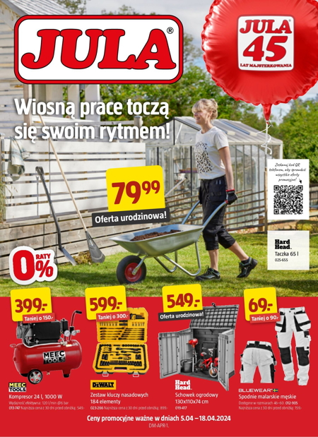'Wiosną prace toczą się swoim rytmem' - nowa gazetka promocyjna sieci marketów Jula. Polecane promocje z gazetki Jula Taczka Hard Head 65 L - 79,99 zł. Kompresor Meec Tools 24 L 1000 W - 399 zł. Schowek ogrodowy Hard…