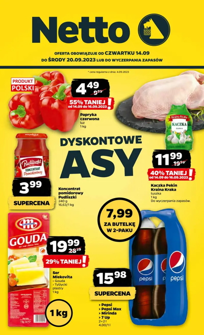 {loadposition linkNetto5} 'Dyskontowe asy' - nowa gazetka promocyjna sieci sklepów Netto. Polecane promocje z gazetki Netto: Papryka czerwona 1 kg - 4,49 zł*. Kaczka Pekin tuszka Kraina Kraka - 11,99 zł*. Koncentrat pomidorowy Pudliszki 240 g - 3,99 zł.…